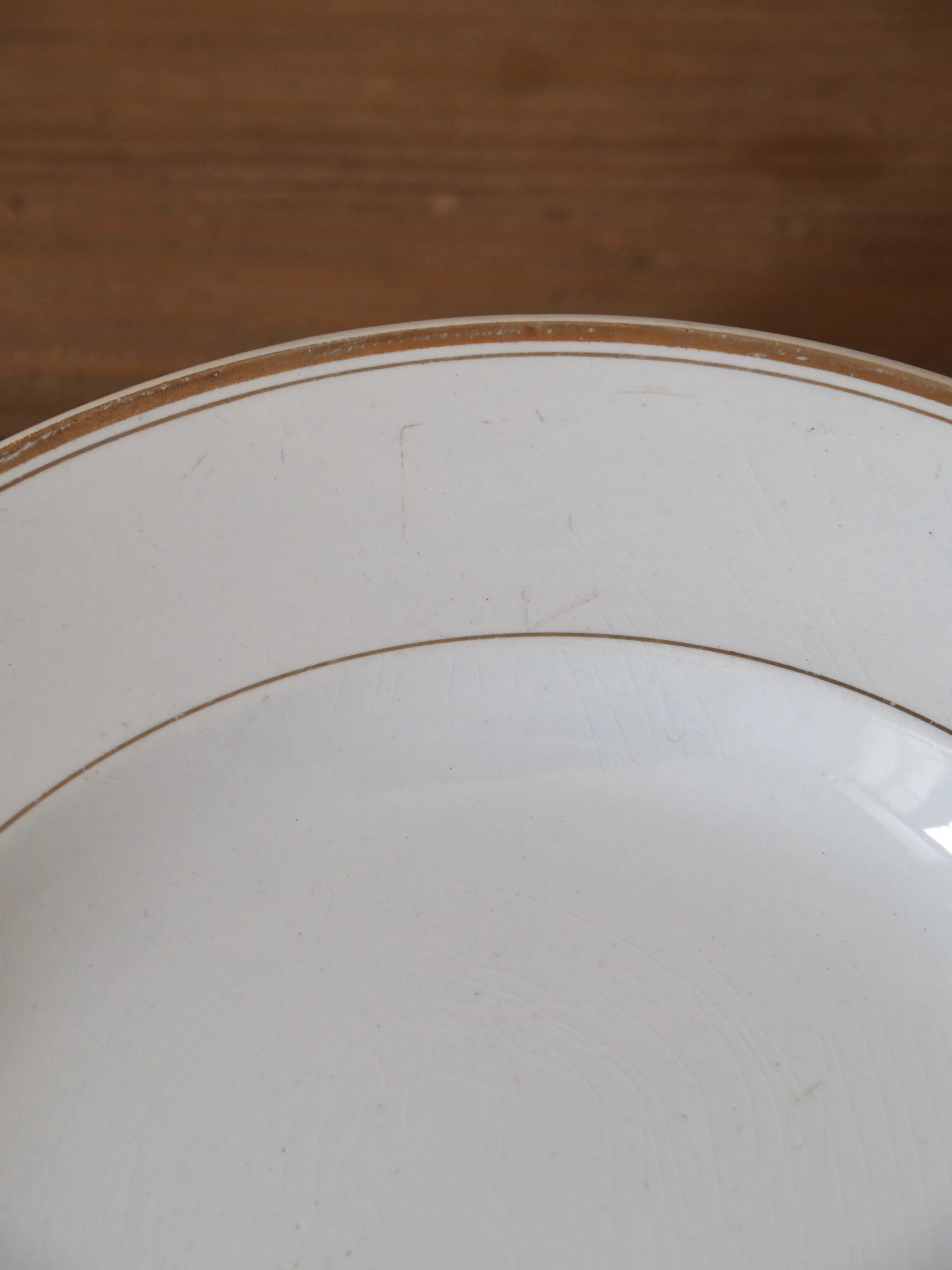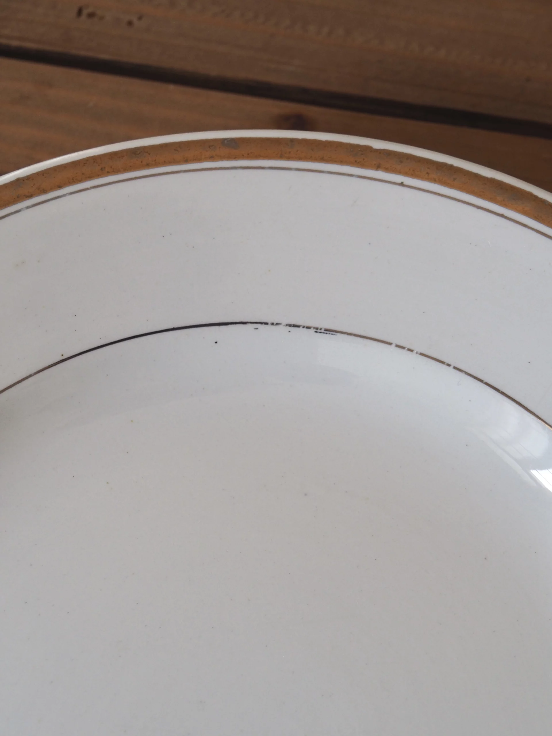 Cette assiette blanche et or en Terre de fer est issue de la manufacture de Sarreguemines. Le décor de ce modèle est composé d’un simple liseré or. L’assiette est estampillée dessous afin de garantir la provenance: Sarreguemines et Digoin. L’usine de Digoin se situe dans la région lyonnaise, elle bénéficie d’un tissu économique et d’un environnement géologique très favorables. Elle puise dans une carrière toute proche offrant l’un des kaolins les plus blancs d’Europe.