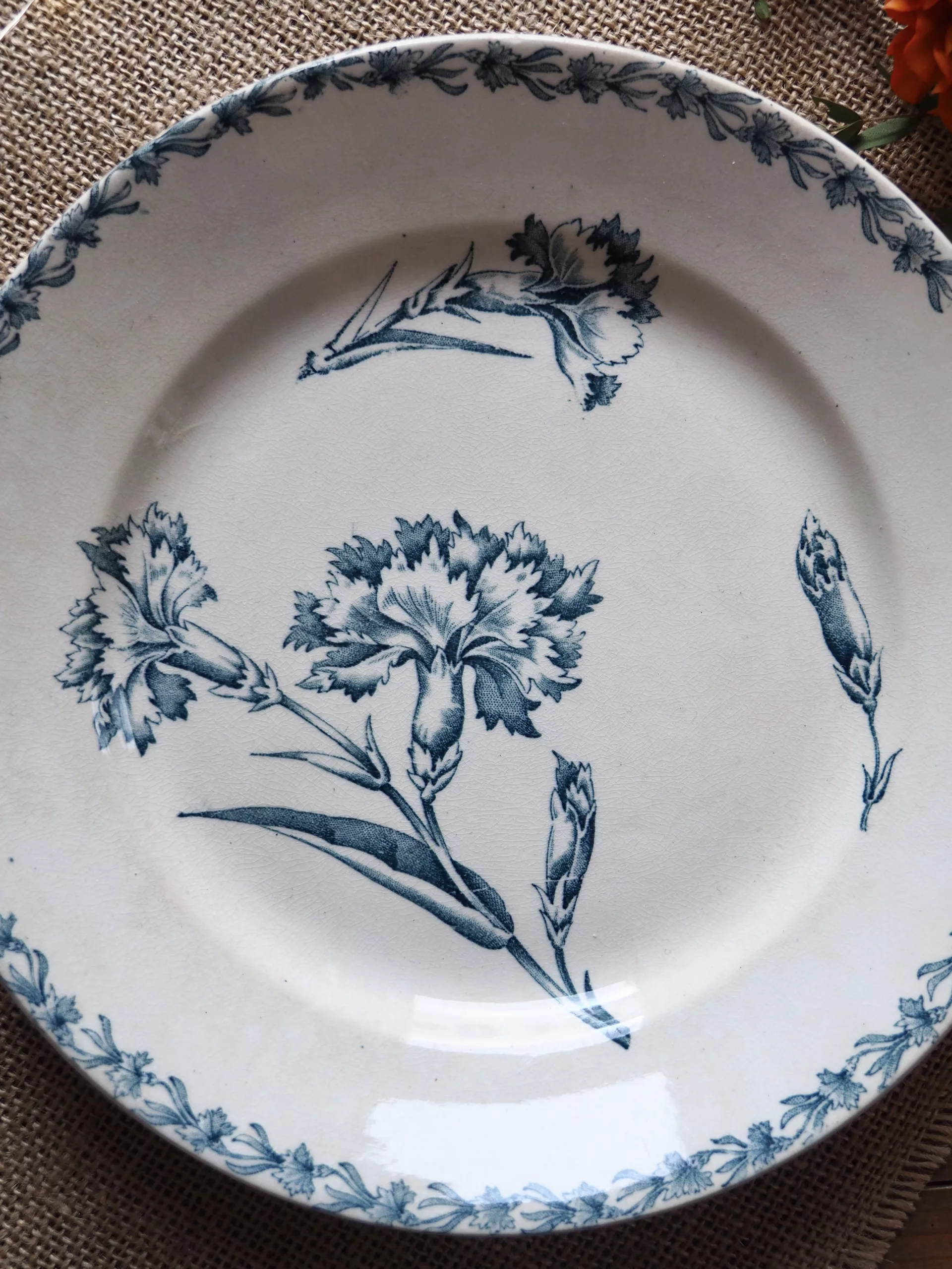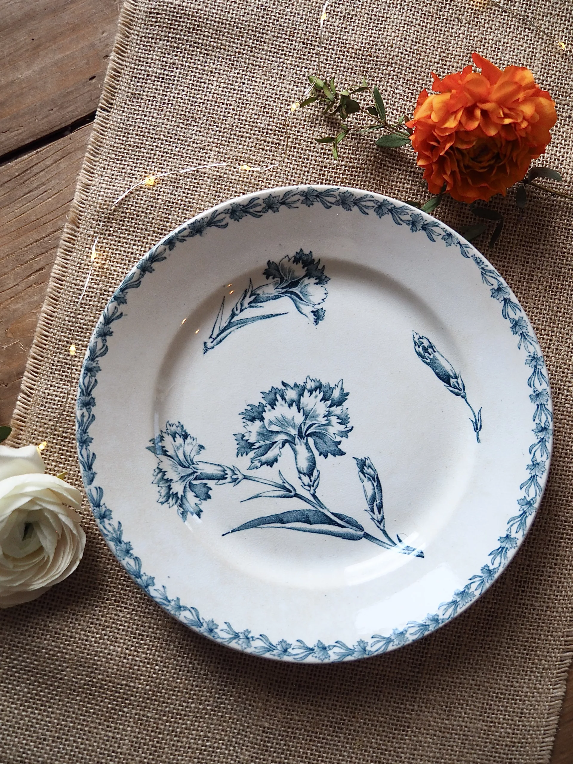 Cette assiette en terre de fer est issue de la manufacture de Luneville. Le décor de ce modèle bleu est composé de motifs fleuris: des oeillets.