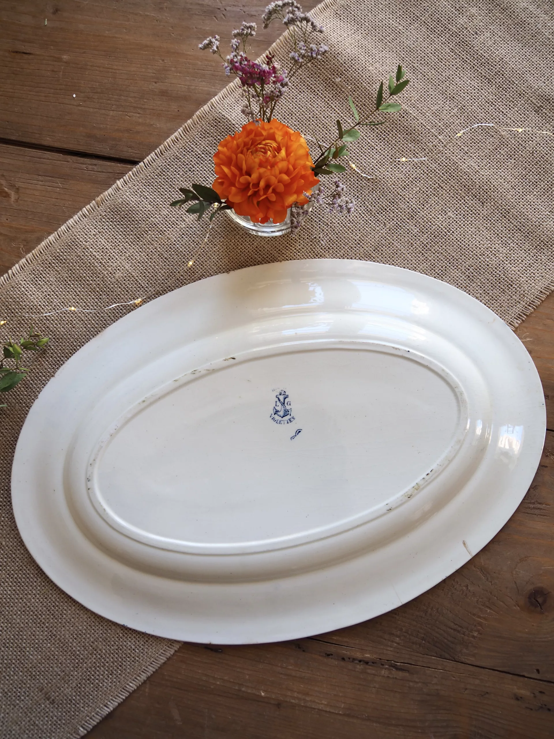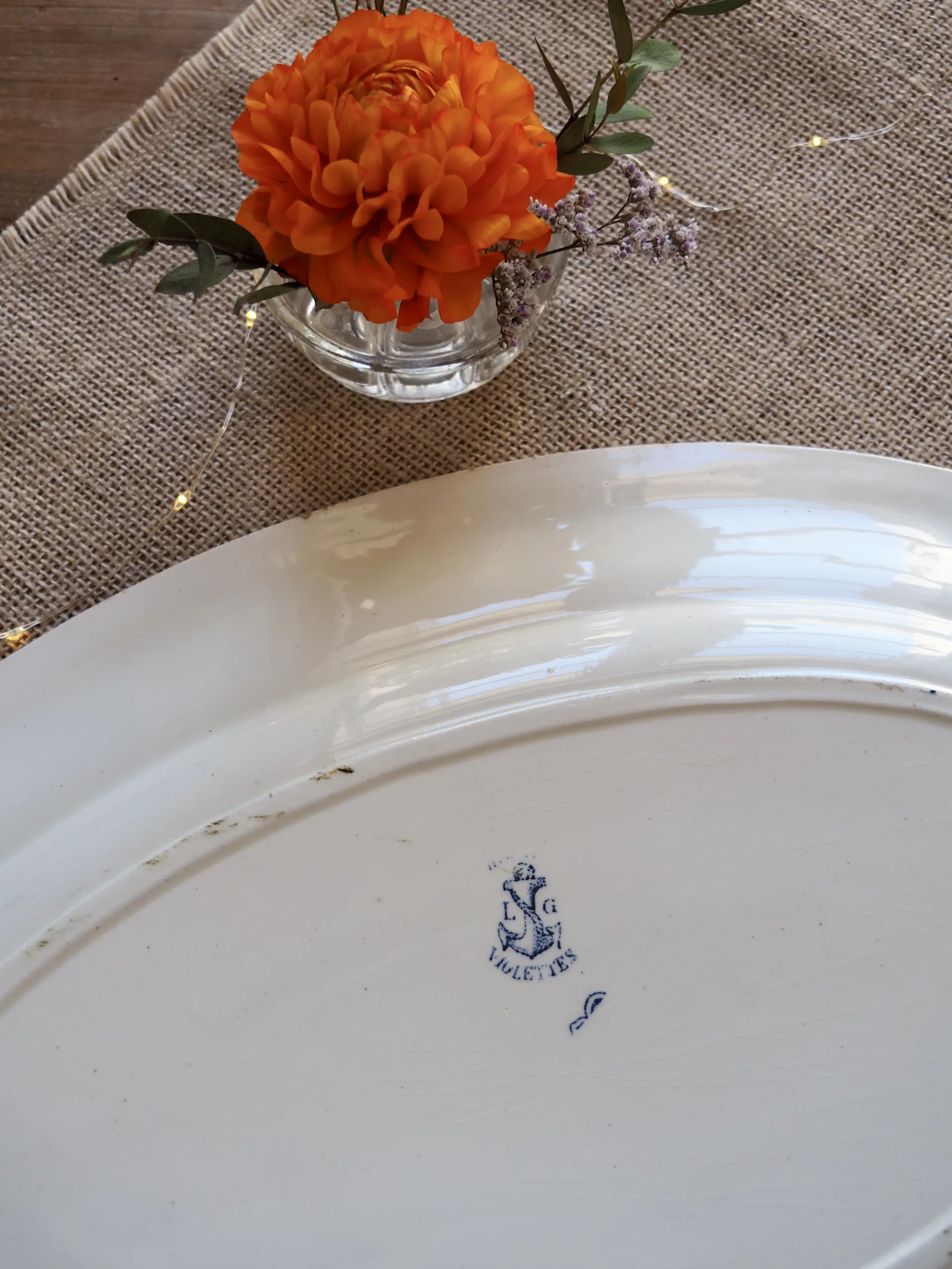 Ce grand plat oval Violettes en terre de fer est décoré de fleurs : la violette.