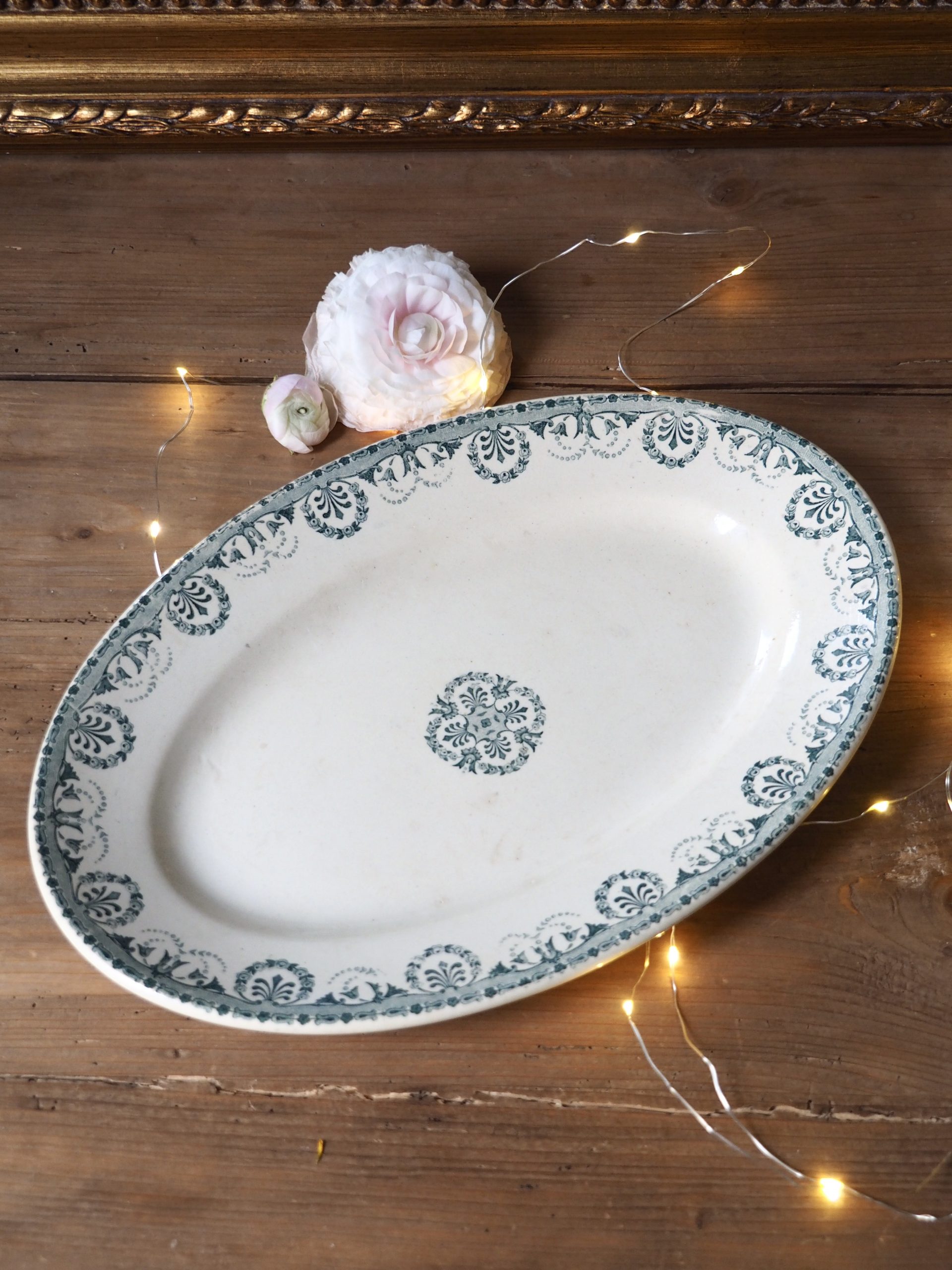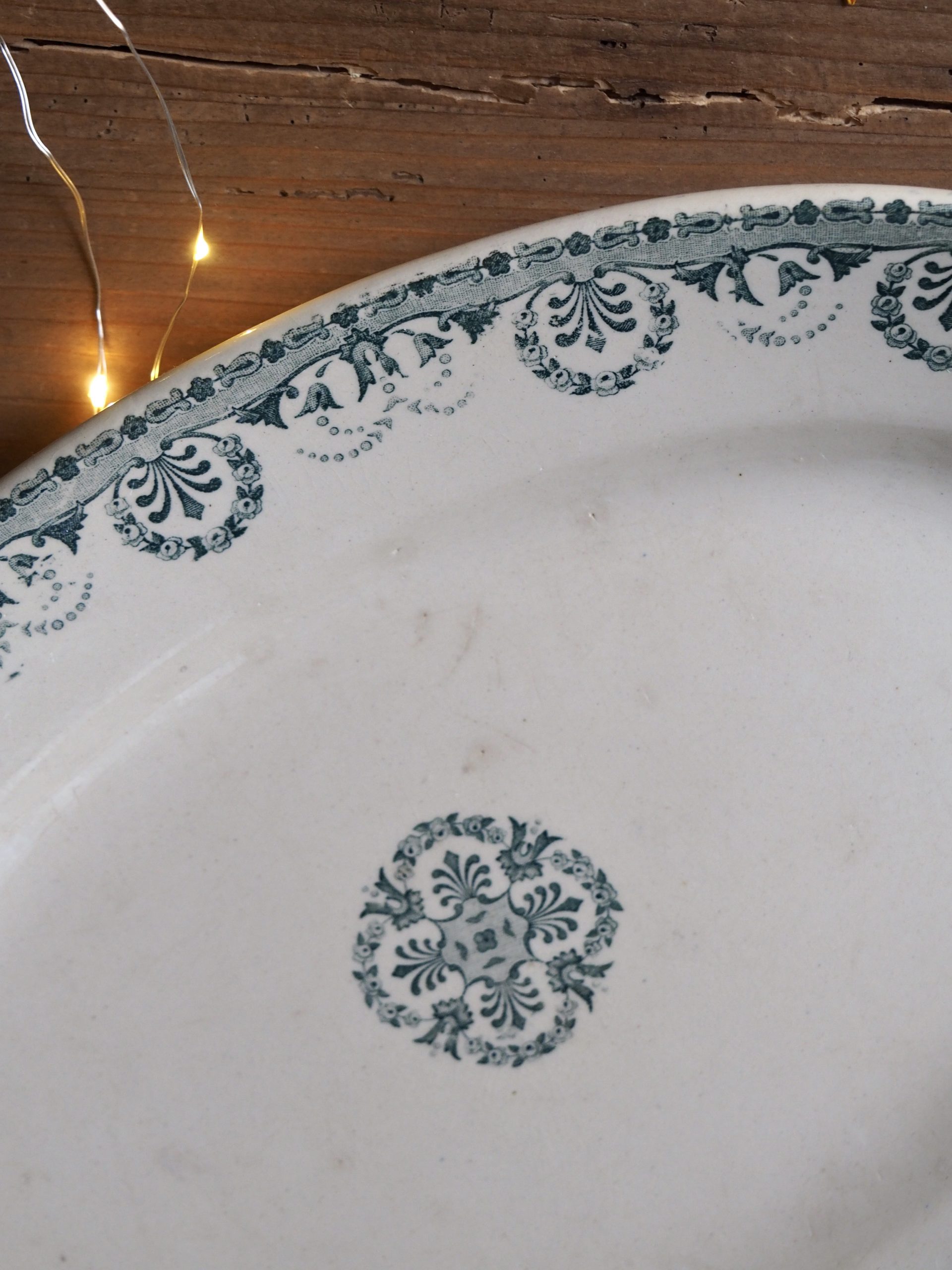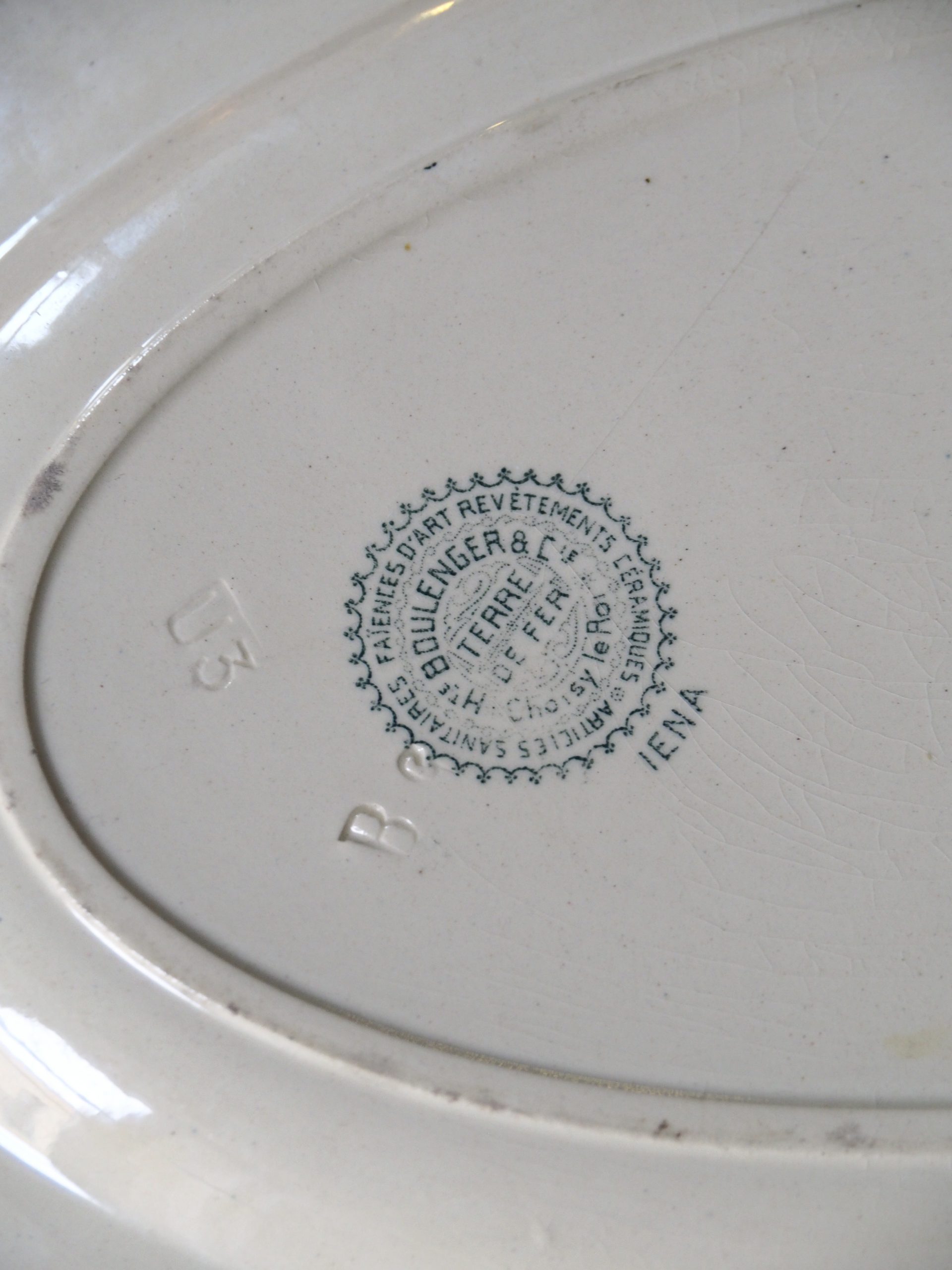 Plat oval en Terre de fer, faïences d’Art Boulenger et Cie de la manufacture de Choisy le Roi, modèle Iena. Le dessins est de style Empire. Le plat est estampillé dessous afin de garantir sa provenance.