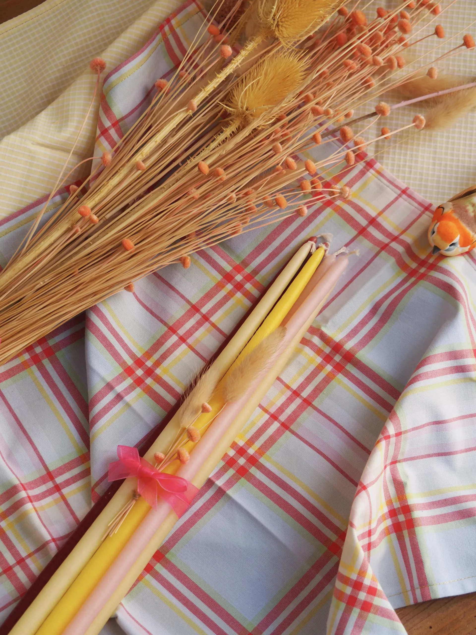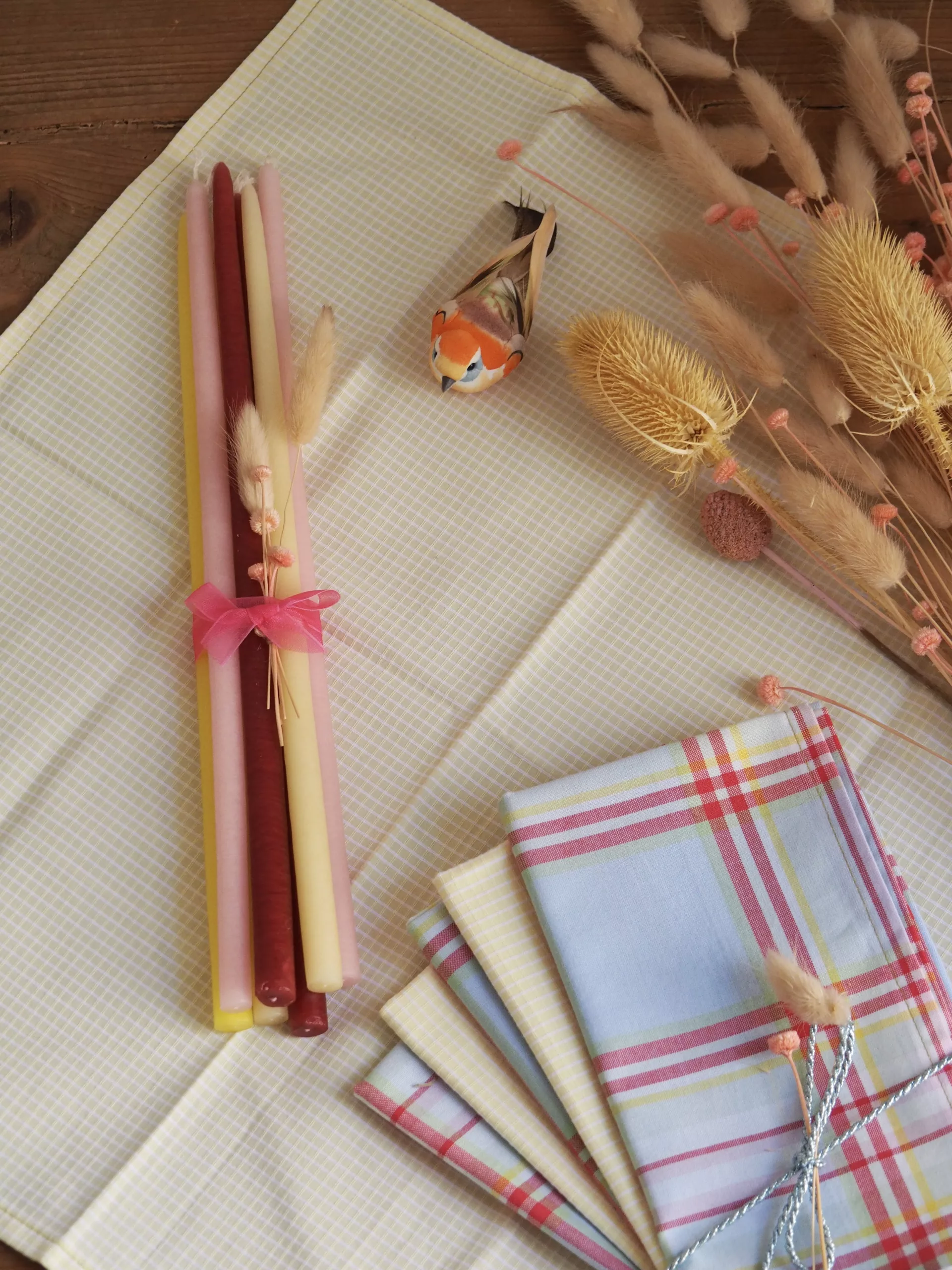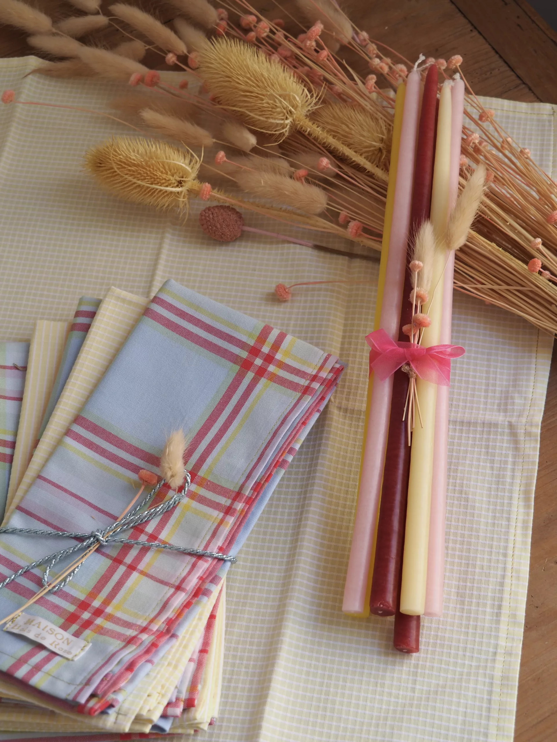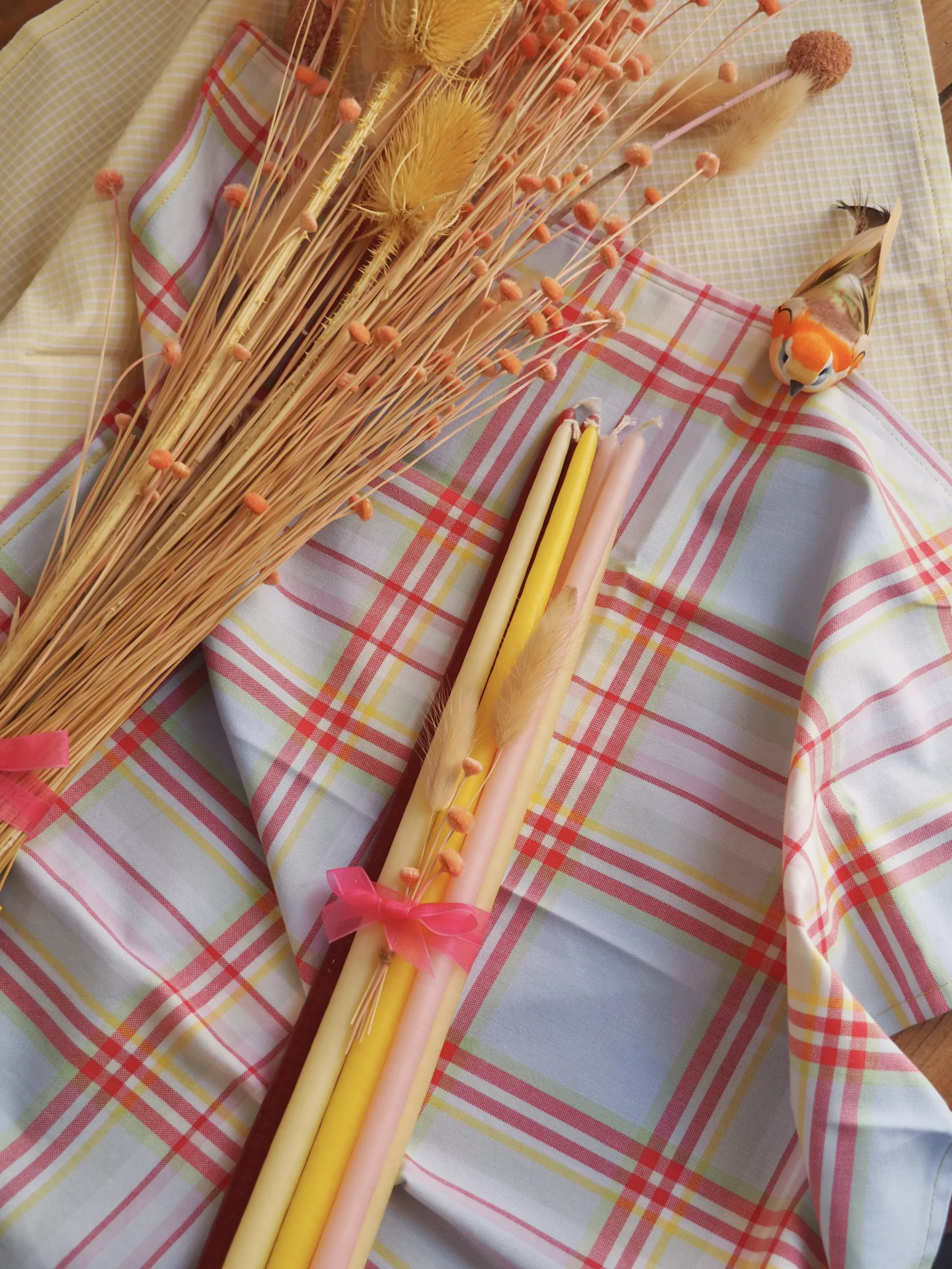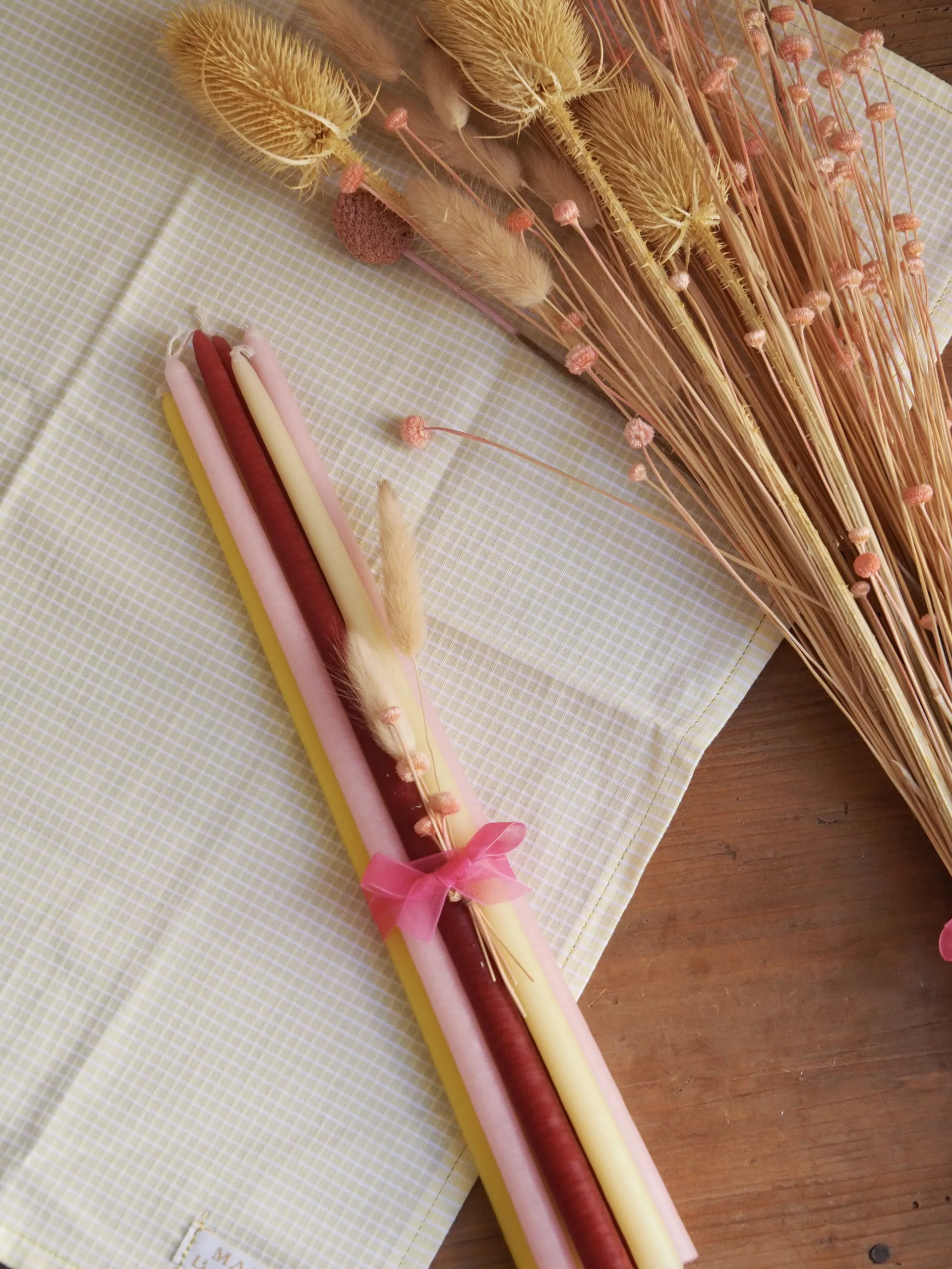 Les bougies proviennent de la Ciergerie des Prémontrés. Cette entreprise française perpétue le savoir-faire ancestral des moines de l’Abbaye des Prémontrés, elle est classée entreprise du patrimoine vivant. Chaque bougie est le fruit d’un travail artisanal de qualité à la finition unique. Elles sont fabriquées par un Maître Cirier via un procédé datant du XVème siècle nommé la plongée. Ce procédé permet de créer des cierges coniques. Les mèches sont en coton.
