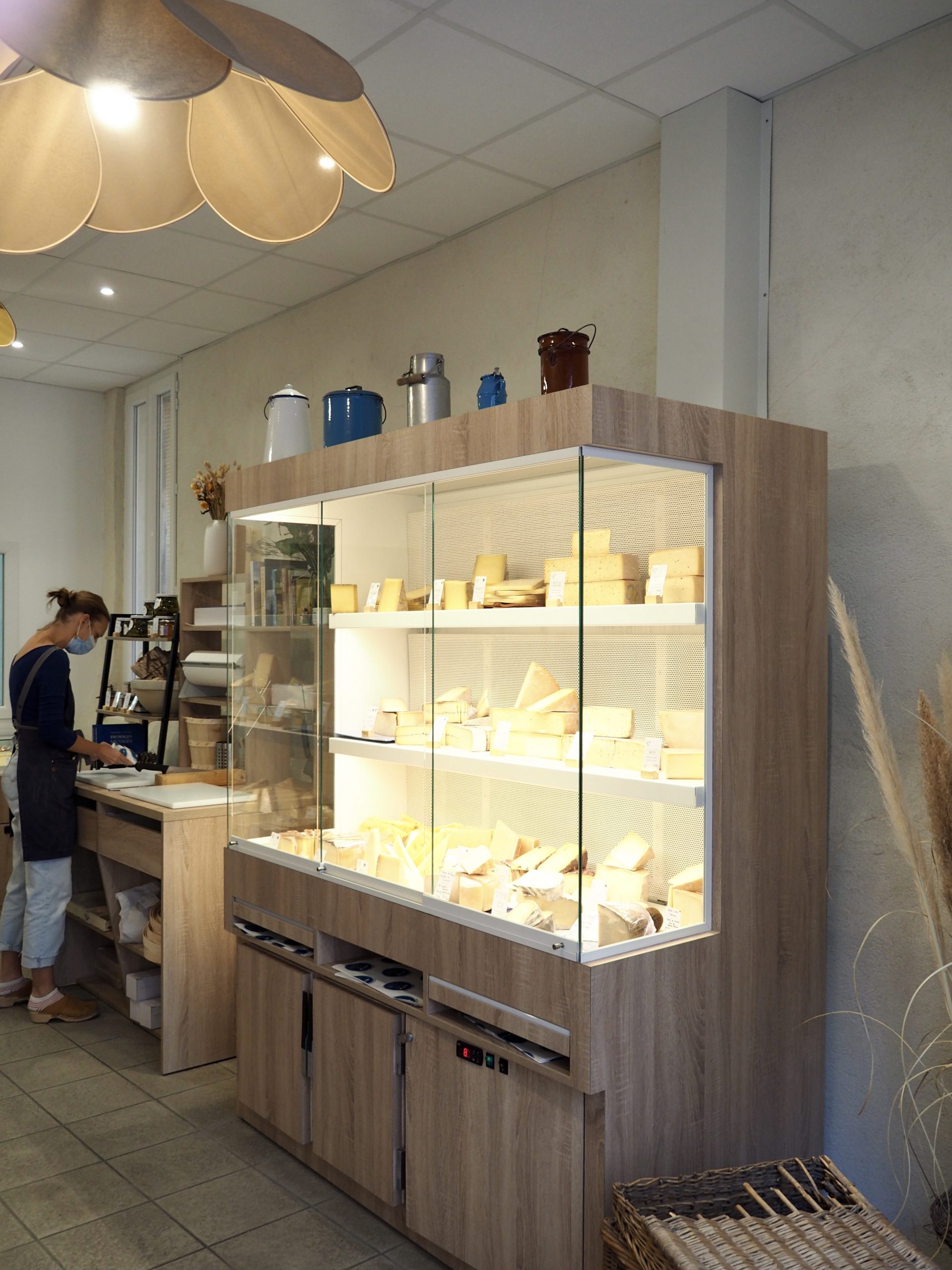 Dans cette belle boutique épurée et lumineuse de la rue Sainte, il n’y a pas le classique comptoir réfrigéré, mais de jolies vitrines. On passe ainsi de la vitrine des yaourts à celle des fromages, dont celle des fromages de chèvre. Audrey me présente les plus belles appellations fromagères, des fromages fermiers français mais aussi les produits maison de la Laiterie. « Les fromages fait maison sont issus de lait bio et équitable de vache, chèvre et brebis. Ils sont également saisonniers afin de respecter le cycle naturel des produits. » La grande distribution a tendance à nous faire oublier que pour le fromage il y a des saisonnalités tout comme pour les fruits et les légumes et il n’est pas possible de les trouver toute l’année. Les vaches produisent du lait toute l’année mais le goût varie en fonction des saisons et de ce qu’elles mangent. Pour le lait de chèvre et de brebis il faut en profiter de février à octobre.