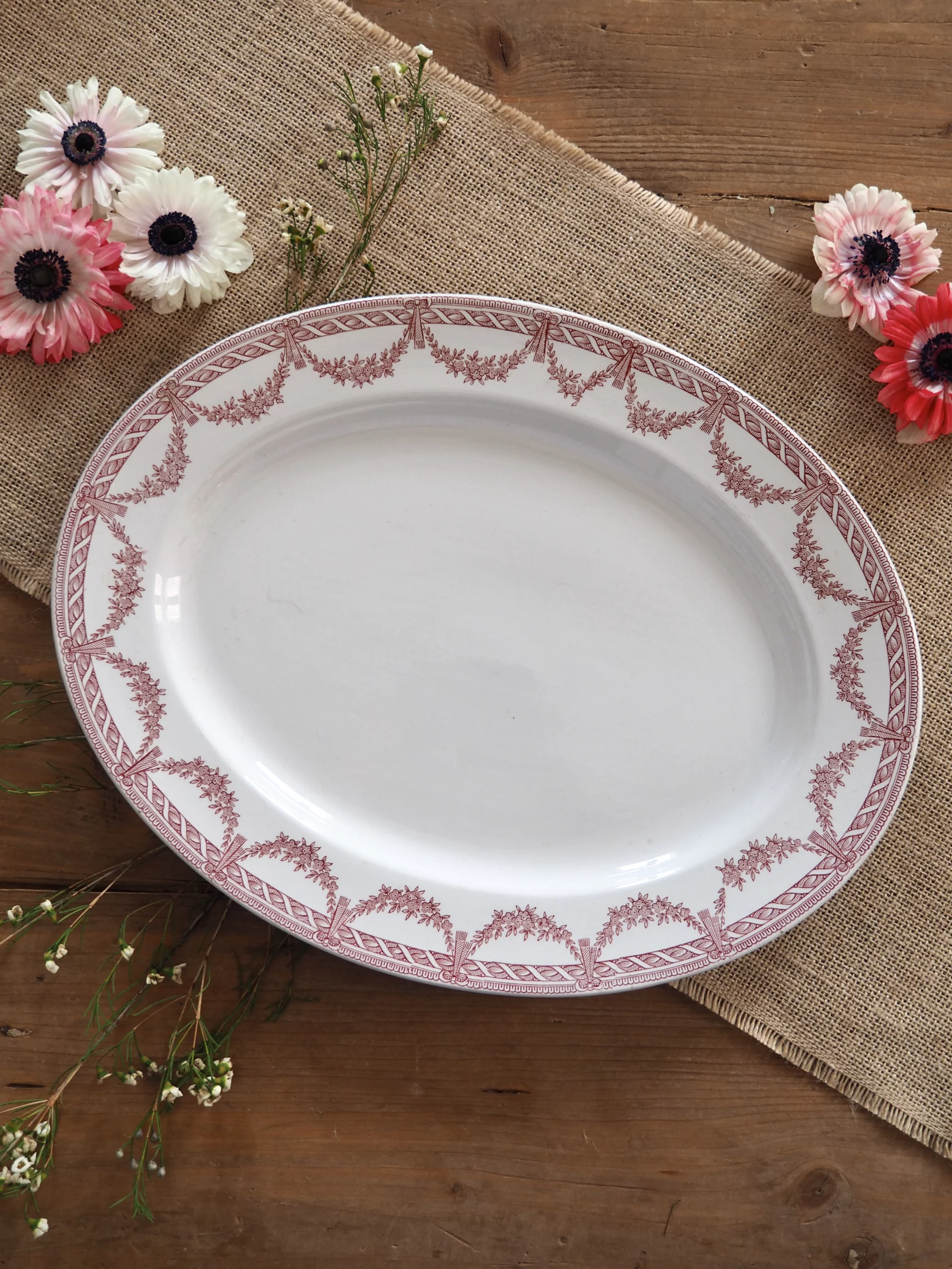 Le service Empire, en terre de fer, est issu de la manufacture de Sarreguemines. Le décor de ce modèle rose est composé de guirlande de fleurs, de noeuds et d’un contour torsadé.